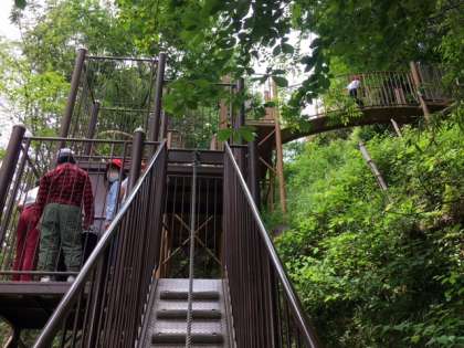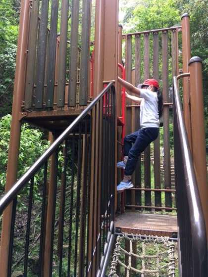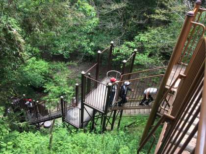 昼食後は、アスレチックで楽しみます。森の中にスリリングなアスレチックコースが設置されています。