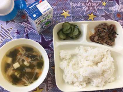 今日の給食献立は、ごはん・プルコギ・きゅうりの甘酢漬け・豆腐とわかめのスープ・牛乳です。