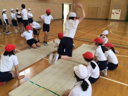 5時間め、体育の時間に体力測定をしめした。対前屈と幅跳びをしています。