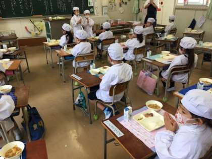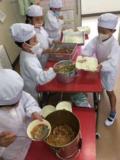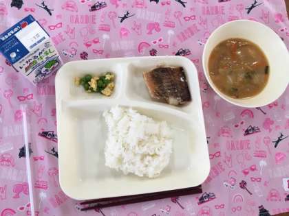 今日の給食献立は、ごはん・赤魚の醤油だれかけ・えんどうの卵とじ・みそ汁・牛乳です。