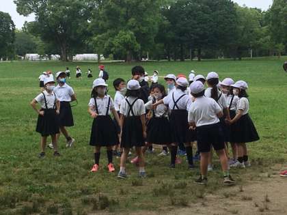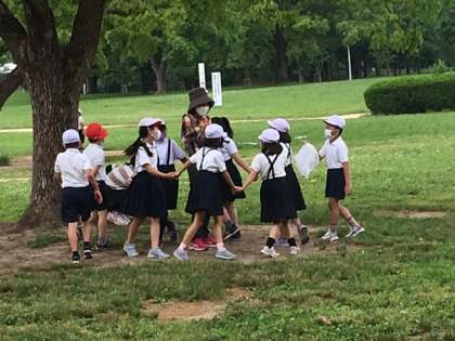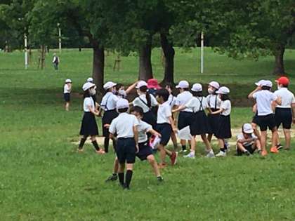 先生と子どもたちが遊んでいます。「にゃーにゃにゃ、にゃーにゃにゃ」と言いながら囲んでます。