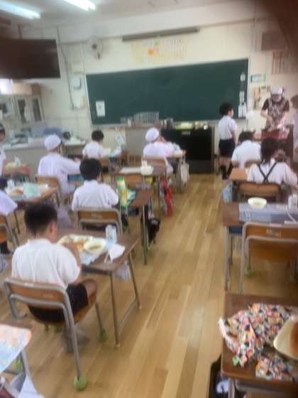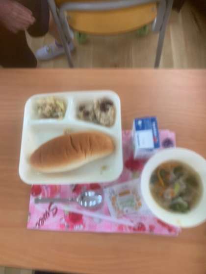 今日の給食献立は、コッペパン・金時豆の中華おこわ・中華スープ・ツナと野菜のオイスターソース炒め・アプリコットジャム・牛乳です。