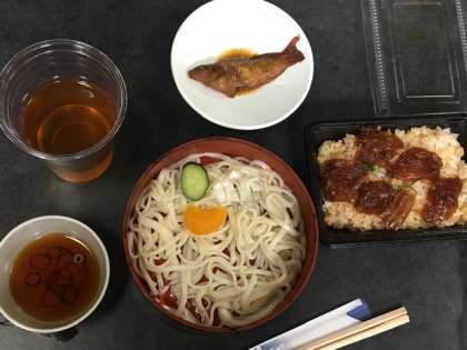 てこね寿司と冷やしうどん、それに、昨日の沖ノ島での魚釣りでみんなが釣った魚を料理して出してくださいました。