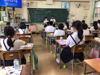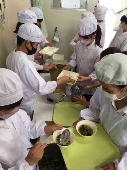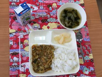 今日の給食献立は、和風カレー丼・すまし汁・和梨(缶詰め)・牛乳です。