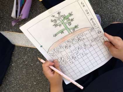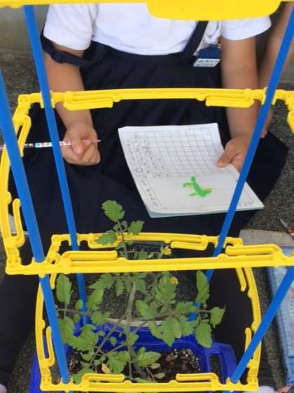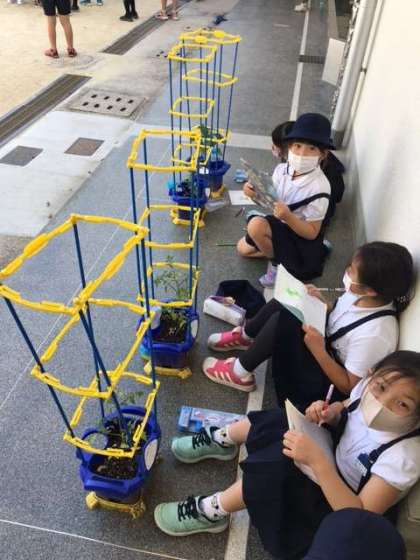 2年生が、自分たちが育てているミニトマトの絵日記を描いています。
