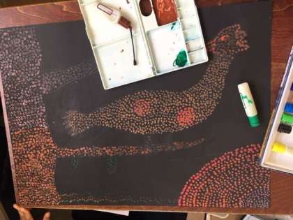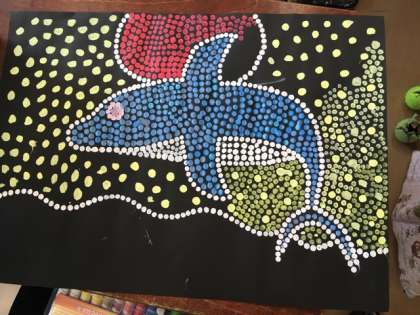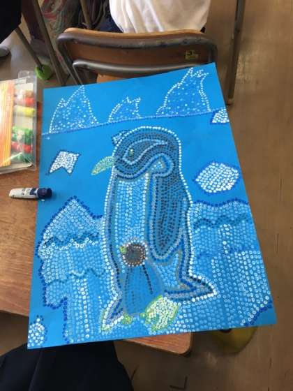 4年生の点描画、アボリジニーアートが完成に近づいてきました。