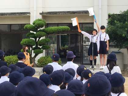 ゲームの後は、保健委員会からのお知らせです。食事どきの姿勢や食後の歯みがきについて、手作りの画用紙歯ブラシで説明してくれました。