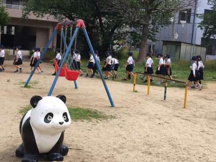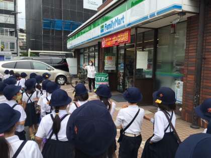 校区の町の様子を、みんなで歩いてみて回りました。まずはパンダ公演からスタートして、リニューアルファミマを見て、お店や施設など、たくさん見て歩きました。