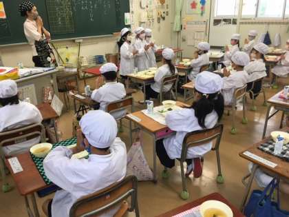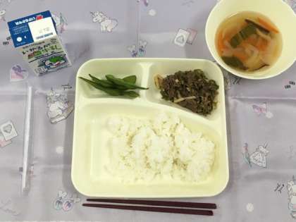 今日の給食献立は、ごはん・チンジャオロースー・ハムと野菜の中華スープ・枝豆・牛乳です。