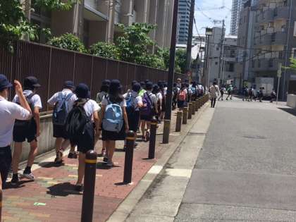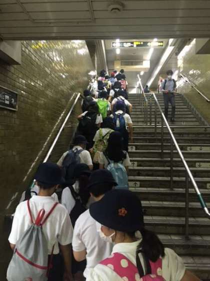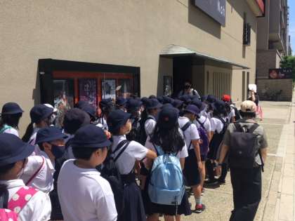 今日の午後、5年生は北区の事業で能・狂言を観に来ています。地下鉄谷町線で谷町四丁目まで来て、大槻能楽堂という由緒ある能の舞台にやってきました。