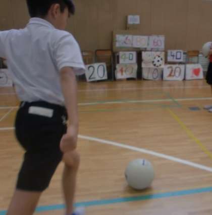 一人3回ずつボールをけり、当たった的の点数を競います。