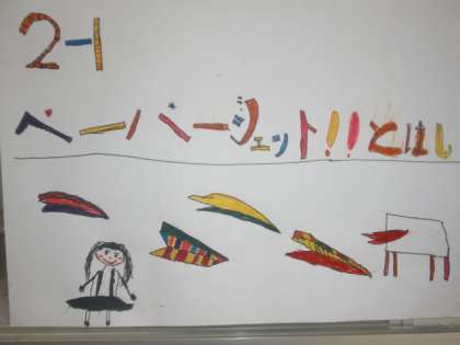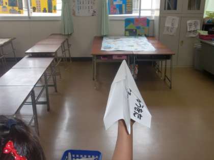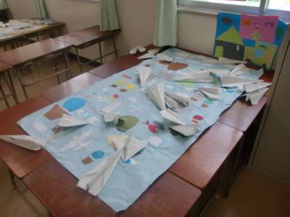 紙飛行機をとばして、向こうの町(絵)のうえに乗せます。