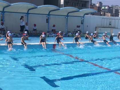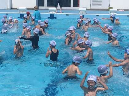 1年生の2回めの水泳授業です。前回から少し進んで、水遊びから、ちょっと潜ってみる、をしました。