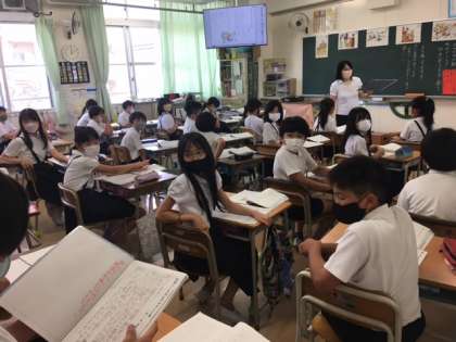 4時間め、5年生で研究授業を行いました。国語の授業で、教科書の「世界でいちばんやかましい音」の内容です。