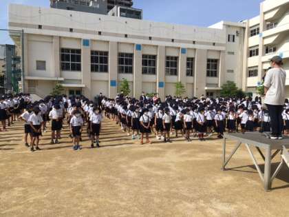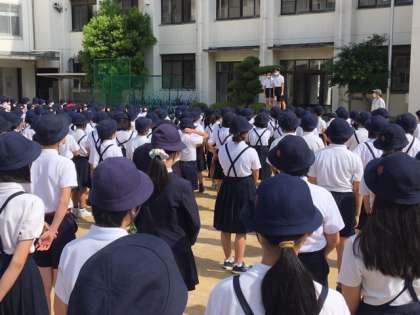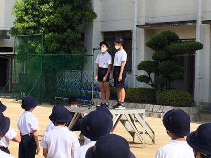 今日は月曜日、児童朝会の日です。梅雨明けのように、青空が広がった快晴です。
