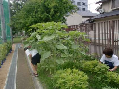 久しぶりに学習園に行ってみると、子どもたちが植えた花や野菜が急に大きくなっていて驚きました。惠の雨ですね。