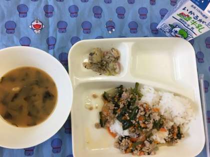 今日の給食献立は、豚挽き肉とニラのそぼろ丼・キャベツの赤紫蘇和え・味噌汁・牛乳です。