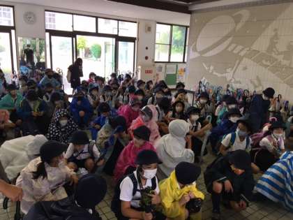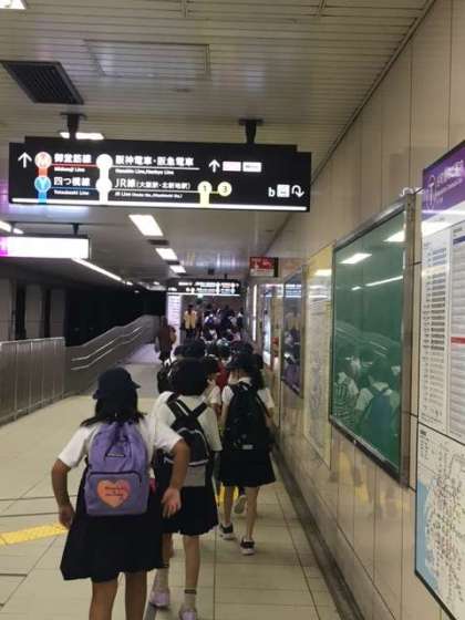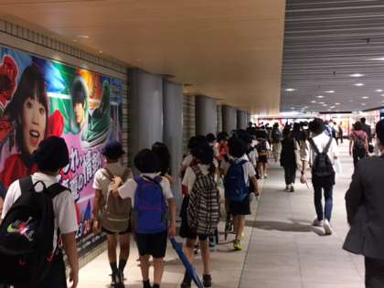 今日は、4年生の社会見学で大阪市立科学館に行きます。地下鉄。乗り継いで肥後橋駅で降りて科学館へ。