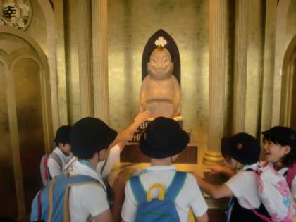 (上)ビリケンさんの足をさすって、「幸せになれますように。」と