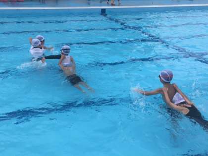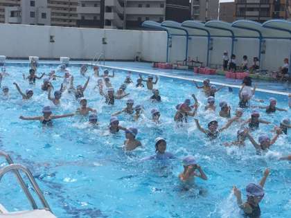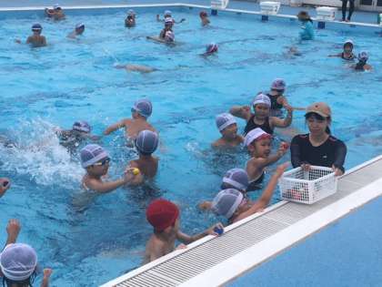 これまで練習してきたことのまとめです。バディの肩につかまってバタ足します。たくさんの子ができるようになりました。