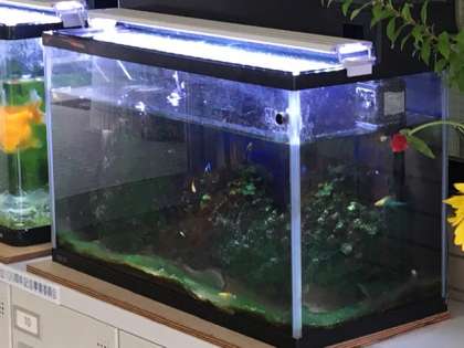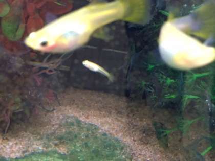 写真では分かりにくいですが、白い小さいのは今月の初め頃に生まれたグッピーで、見えにくいですが、黒っぽいもっと小さいのが、今週初めに生まれたグッピーです。