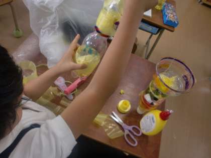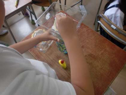 ペットボトルや身の回りの容器などを使って,水に浮かべるおもちゃを作りました。