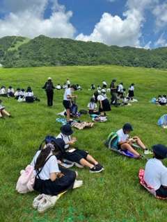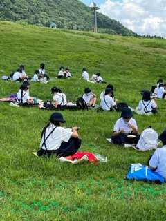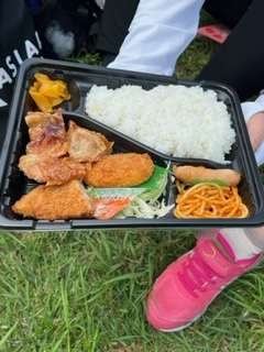 高原で班に分かれて弁当を食べています。いつもより美味しく感じます。今日の弁当はこのとおりです。