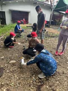 今日の朝食はカートンドッグづくりです。まず宿舎の人から作り方の説明をうけました。その後、用意した牛乳パックに切り込みをいれ、アルミホイルに包んで牛乳パックに火をつけてある程度燃えたら完成です。