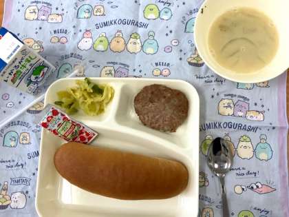 今日の給食献立は、黒糖パン・焼きハンバーグ・キャベツとピーマンのカレーソテー・豆乳スープ・牛乳です。