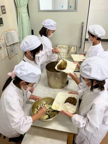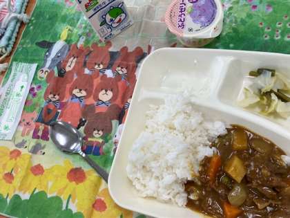今日の給食献立は、ビーフカレーライス(米粉)・野菜のピクルス・ぶどうゼリー・牛乳です。