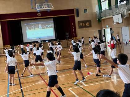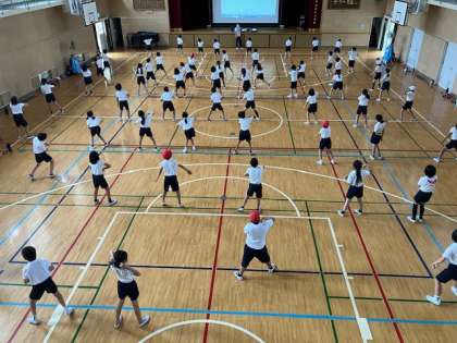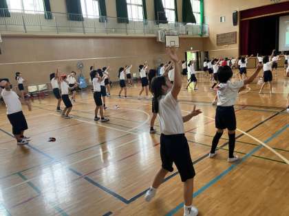 4年生のスポーツデーの団体演技の練習風景です。アップテンポの音楽に乗って、動きの大きいダンスが見ごたえ抜群です。