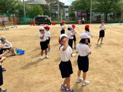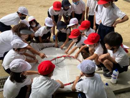 1年生は、運動場でシャボン玉をしました。フラフープ大のシャボン玉にも挑戦しました!
