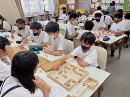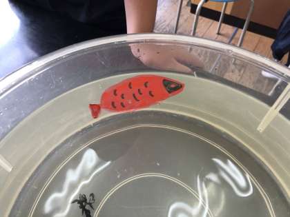 室内ゲームクラブは、将棋・トランプ・オセロを楽しんでいます。順繰りに交代します。科学クラブでは、下敷きにマジックで描いた魚の絵が、水中で浮いて泳ぎ始めました!