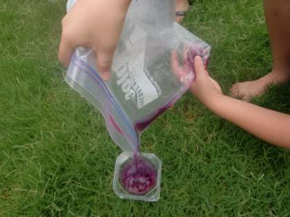 ・あさがおの花と水をビニル袋に入れて、手で揉みます。