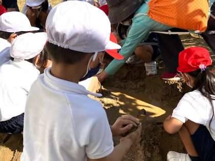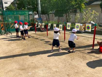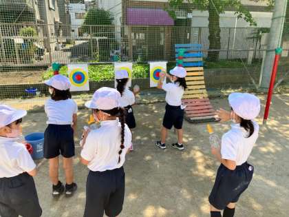 ペットボトルの水てっぽうで、的をめがけて、シューッ!