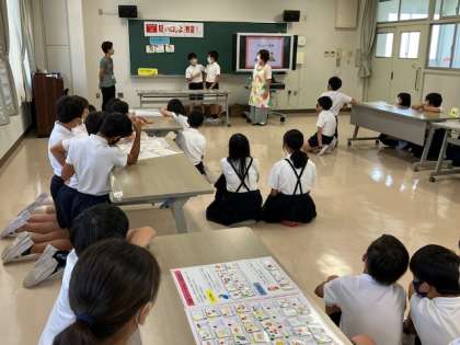 今日は、6年生の授業で出前授業がありました。カルビーからお越しいただいて、食事と栄養についてのワークショップをしてくれました。