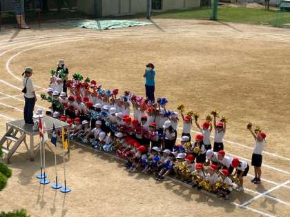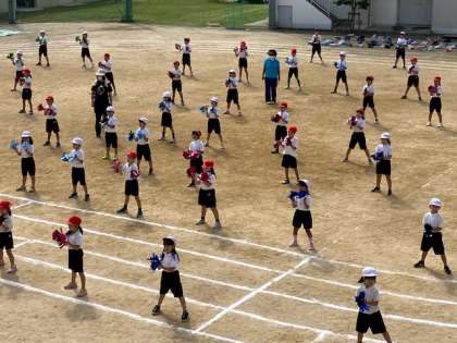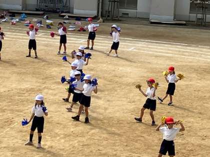 1年生の動きもだんだんとまとまってきました。色ちがいのポンポンを持ってかわいいダンスを踊ります。