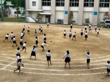 今日の昼休み、運動場優先は6年生。遊びの定番、ドッジボールです。