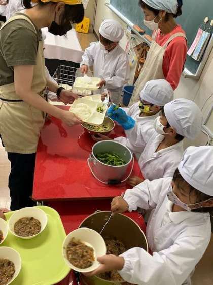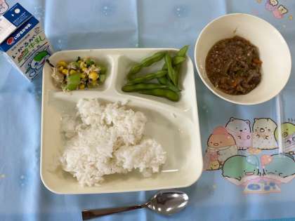今日の給食献立は、ごはん・マーボーなす・チンゲンサイとコーンの炒めもの・枝豆・牛乳です。