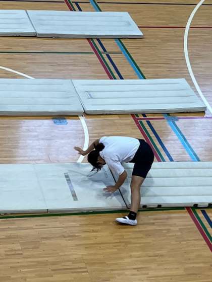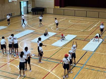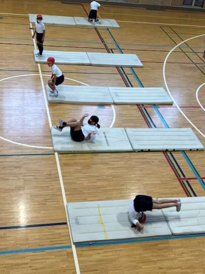4年生では、マット運動に取り組んでいます。今日は、前転・後転・開脚前転・開脚後転の練習をしています。