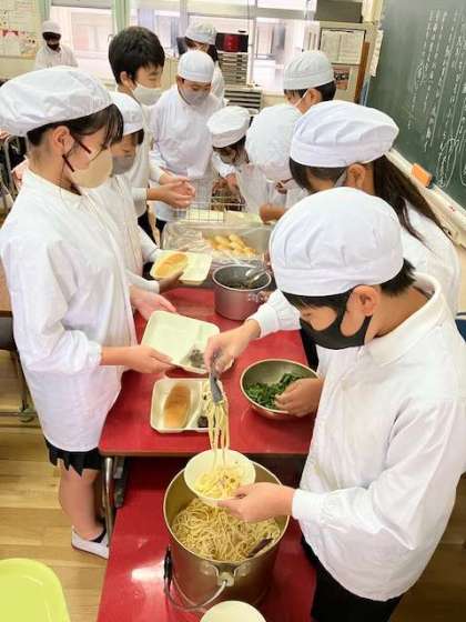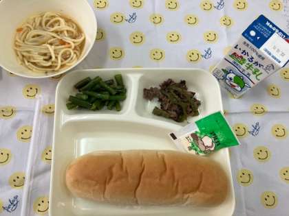 今日の給食献立は、コッペパン・牛肉の香味焼き・帆立貝とトマトのスープスパゲッティ・三度豆のサラダ・ソフトマーガリン・牛乳です。