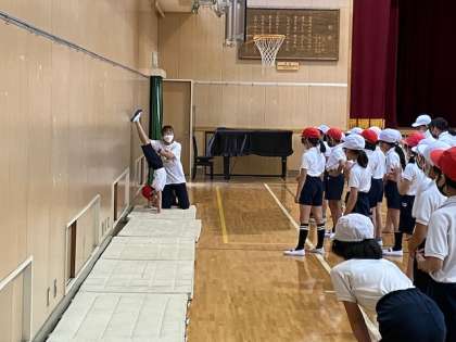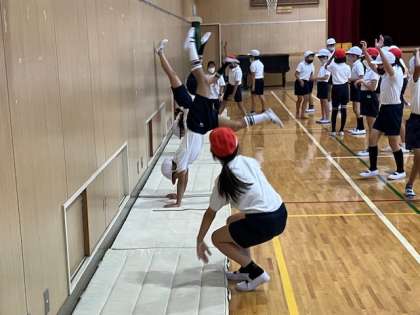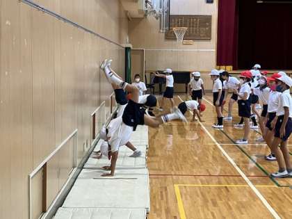 4年生の体育の授業です。体育館ではマット運動をします。倒立の練習をしました。
