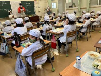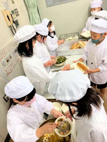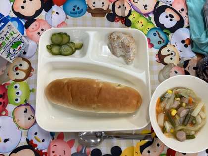 今日の給食献立は、おさつパン・かつおのマリネ焼き・ウインナーとじゃがいものスープ・きゅうりのサラダ・牛乳です。