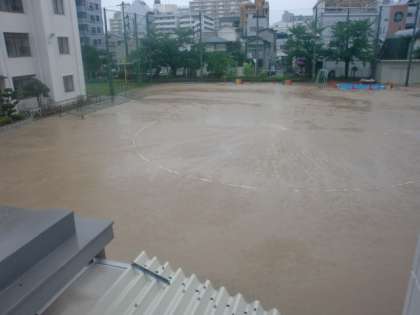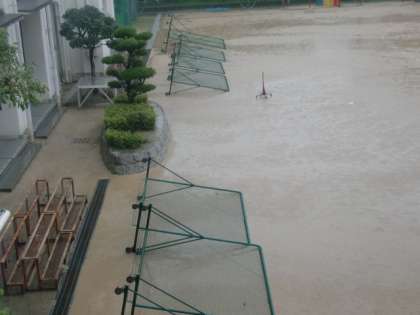 心配していた台風11号は大阪に吐きませんでしたが、今日は雨です。あらかじめ倒しておいた防球ネットも雨に濡れています。