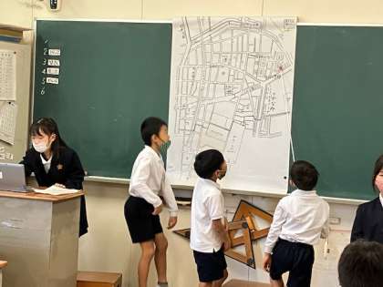 2年生で取り組んできた「町たんけん」。たくさんのお店や病院、お風呂屋さん、神社など、グループごとに調べてきました。