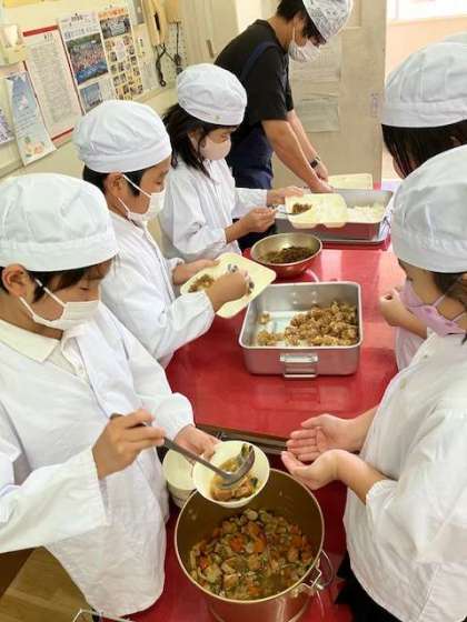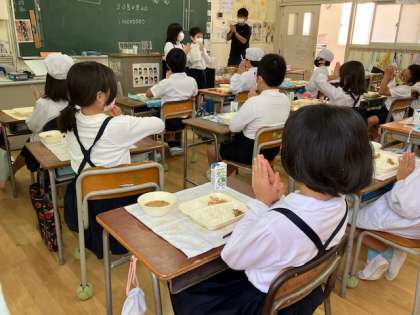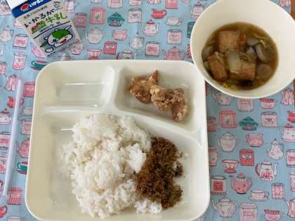 今日の給食献立は、ごはん・おかか菜っぱ・鶏肉の竜田揚げ・厚揚げと野菜の煮物・牛乳です。