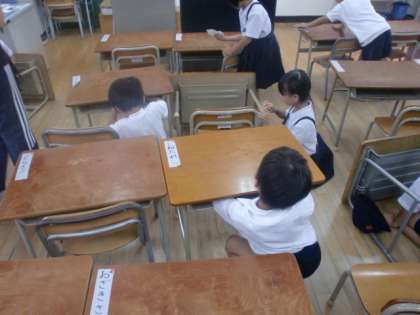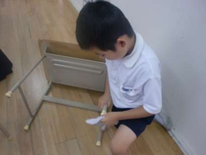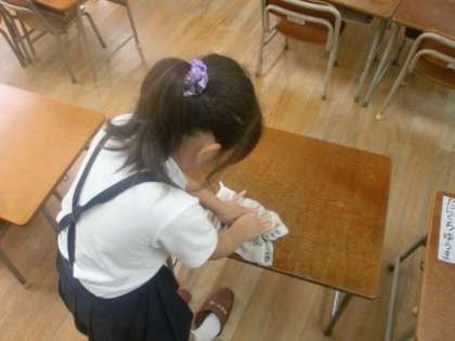 1学期の間、使わせていただいた机・椅子に(ありがとう)の気持ちを込めてきれいにしました。