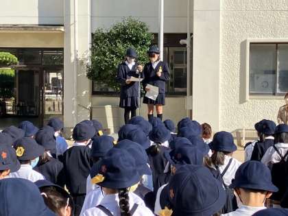 児童朝会では、運営委員会から、今日から始まったあいさつ運動のことを連絡してくれました。