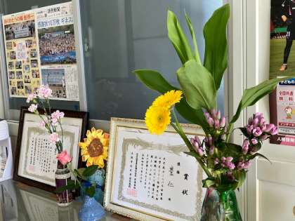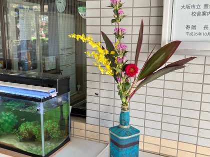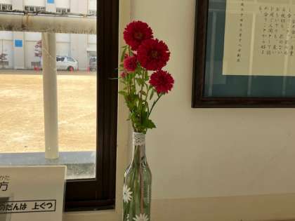 今朝、玄関・事務室前・廊下・いきいき教室前・校長室前・職員室にボランティアの方が花を生けてくださいました。