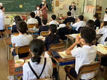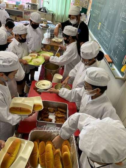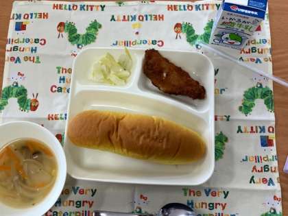 今日の給食献立は、パンプキンパン・タラのフライ・あっさりキャベツ・野菜スープ・牛乳です。